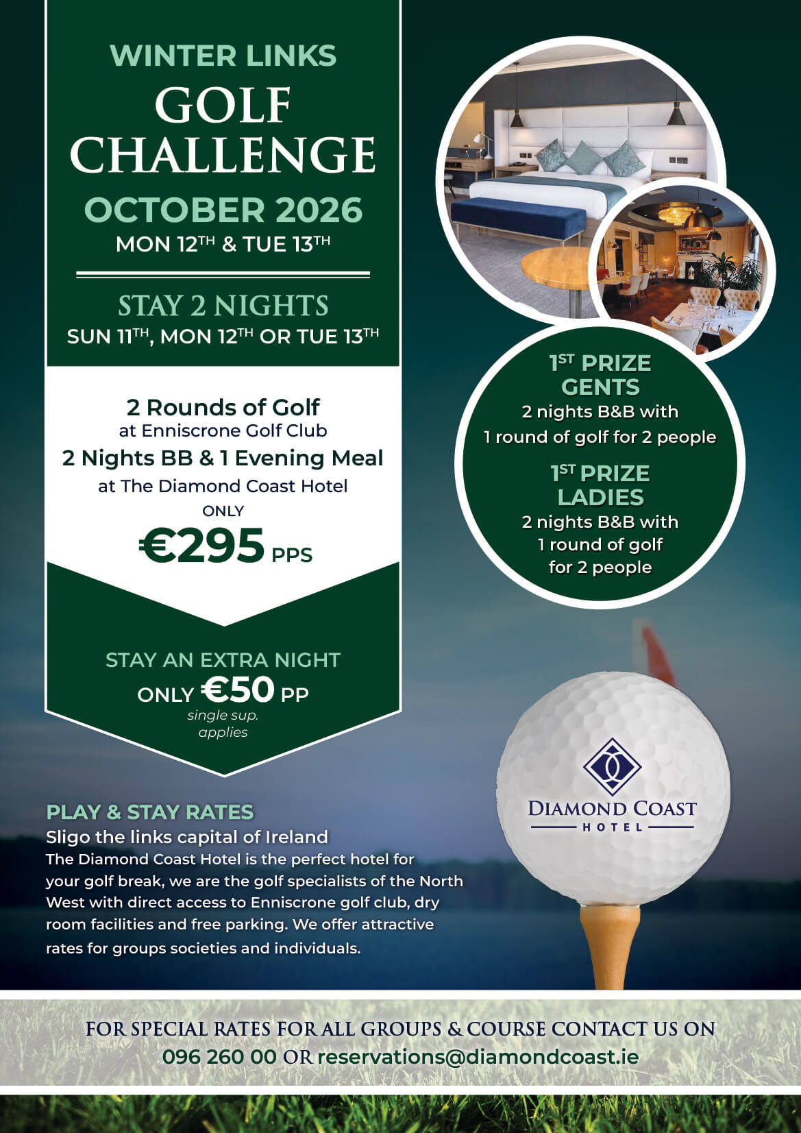 The Diamond Coast Hotel, set in the heart of Sligo’s links capital, is delighted to launch this year’s Winter Links Challenge. October 12th & 13th 2026 Join us for two unforgettable days of golf at the renowned Enniscrone Golf Club, paired with the comfort, hospitality, and warm welcome of the Diamond Coast.